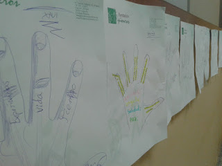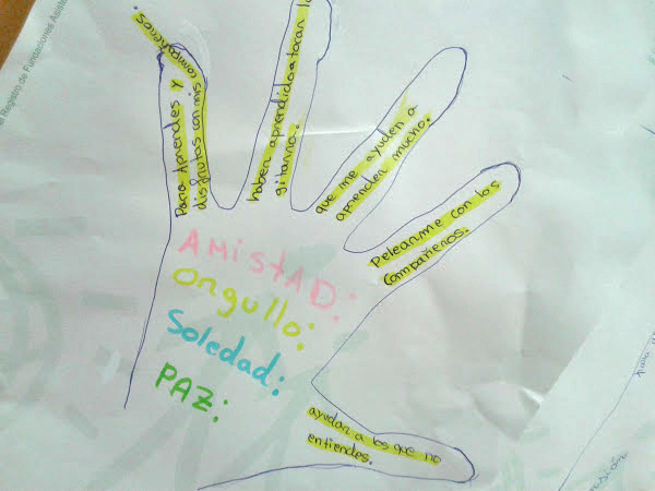 Comenzamos dibujando cada uno y cada una la silueta de nuestra mano derecha o izquierda y fuimos rellenando los dedos dibujados con la respuesta a las preguntas:
