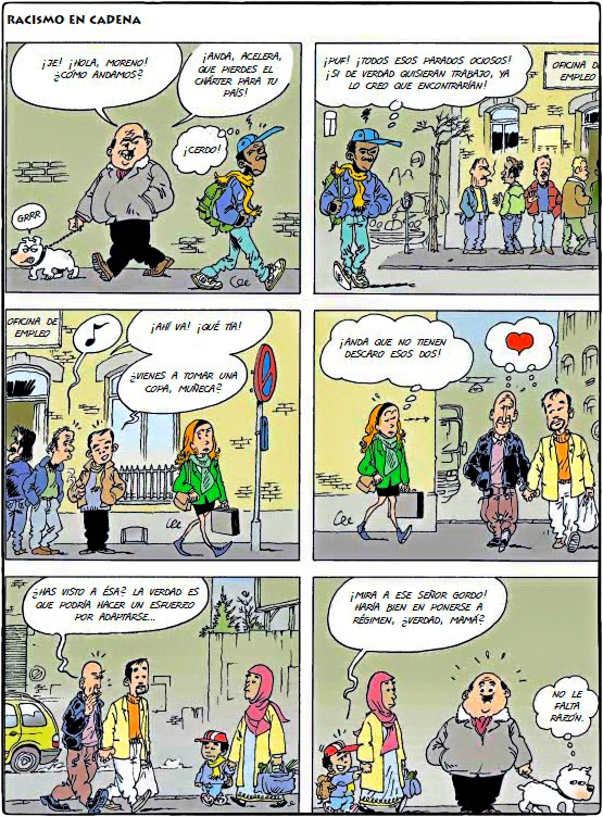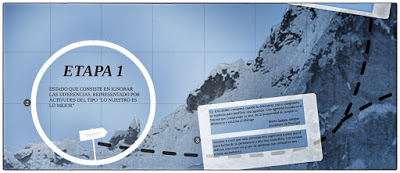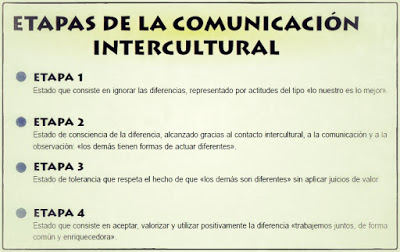 Por ejemplo, en la primera etapa nos encontramos con un momento que consiste en ignorar las diferencias, presentado por actitudes del tipo «Lo nuestro es lo mejor».
